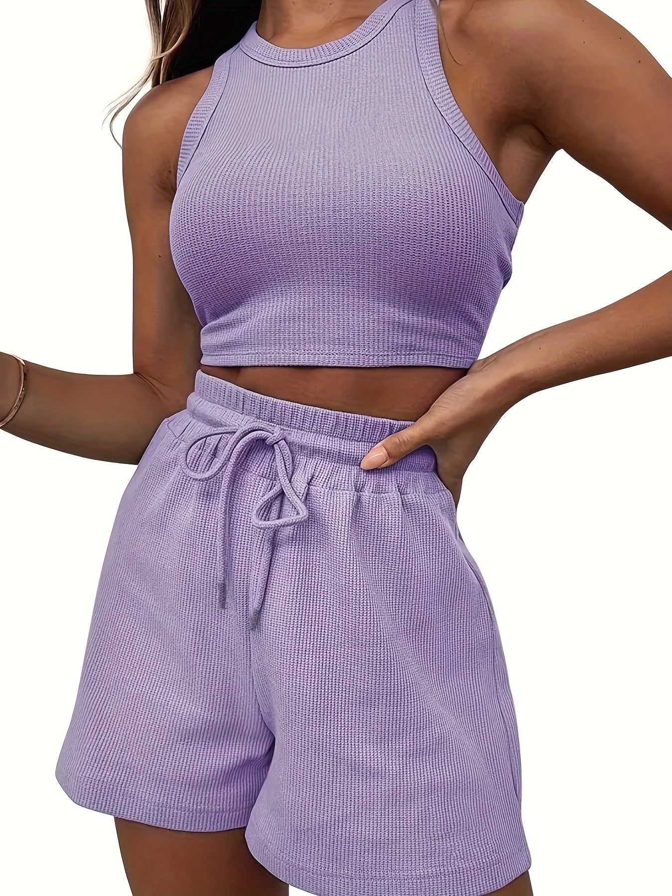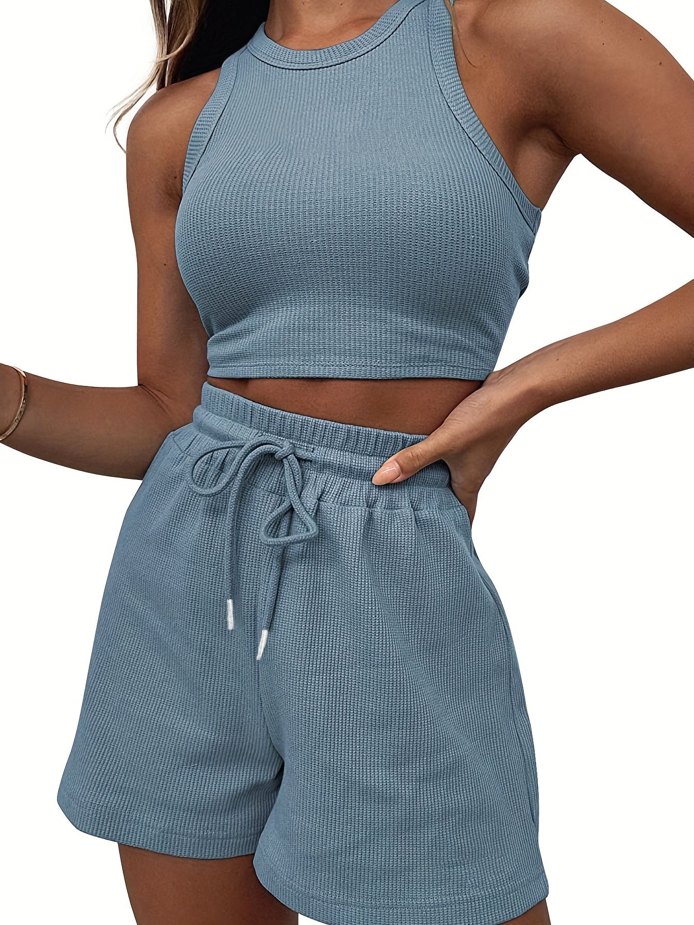 2-Piece Women's Casual Sportswear Set - Comfy Ribbed-Knit Crop Top & Adjustable Drawstring Shorts - Versatile Sleeveless Outfit for Outdoor Activities