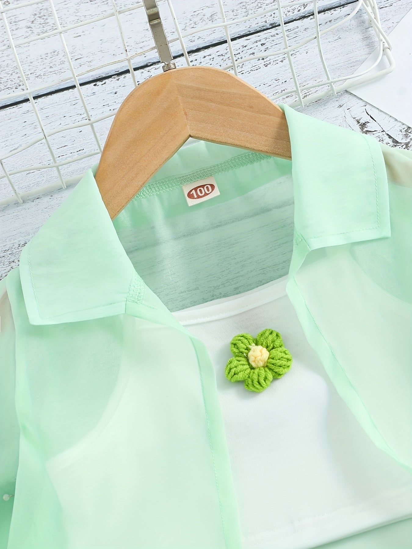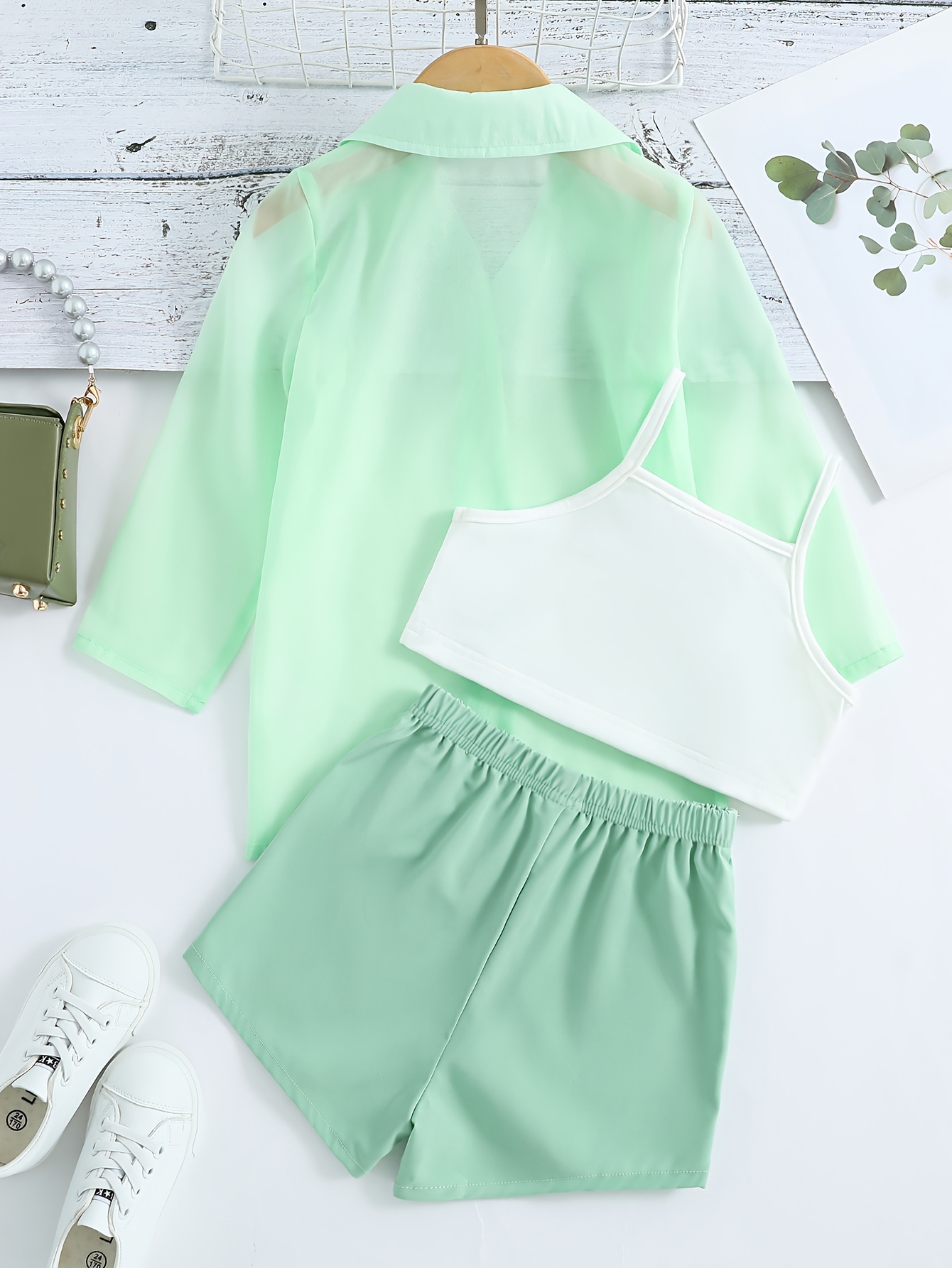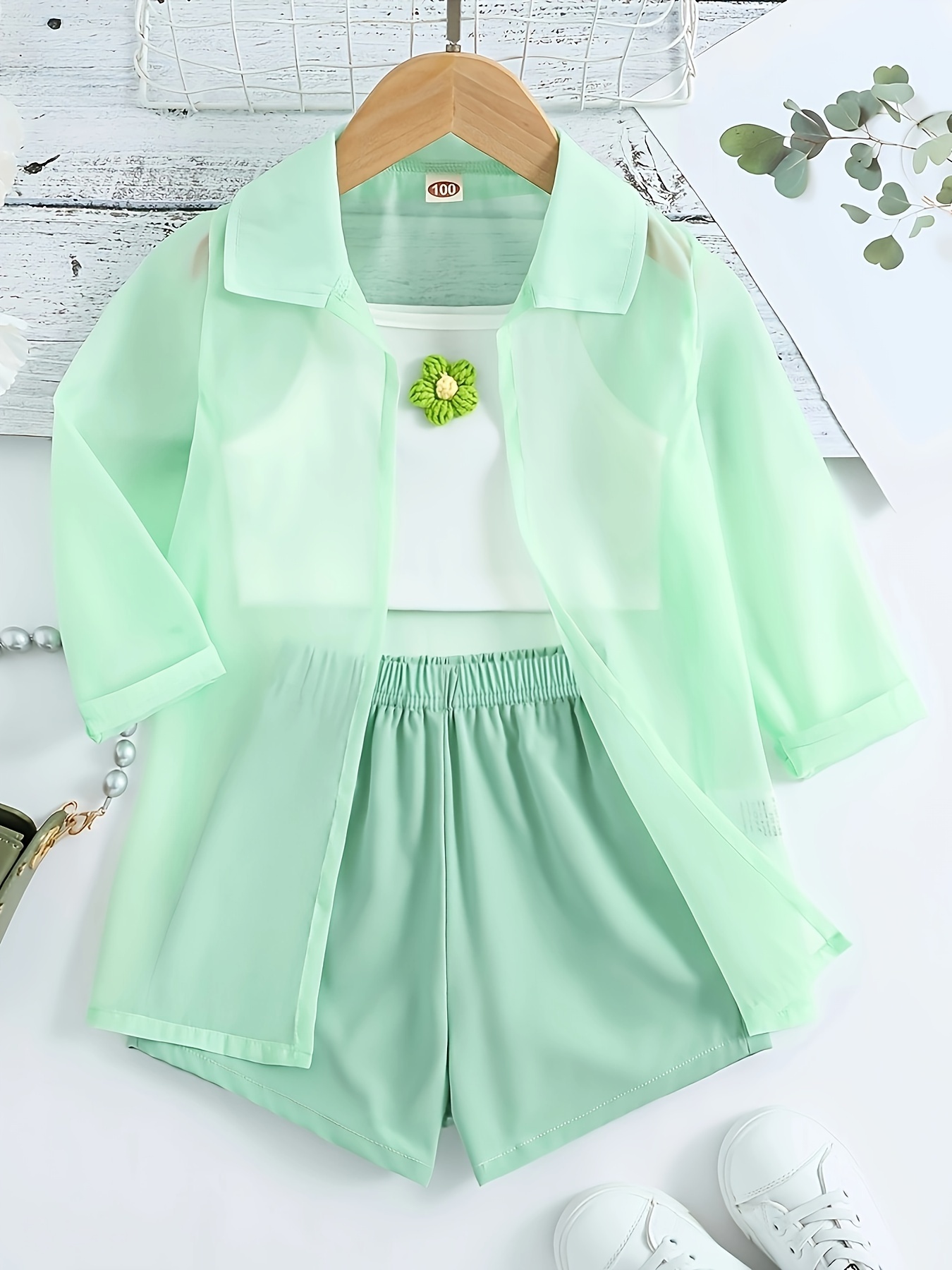 3 Pcs Ultra Thin Long Sleeve Semi-Sheer Shirt & Cami Crop Top & Shorts, Three-piece Shorts Set For Girls