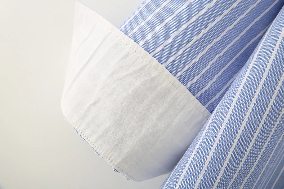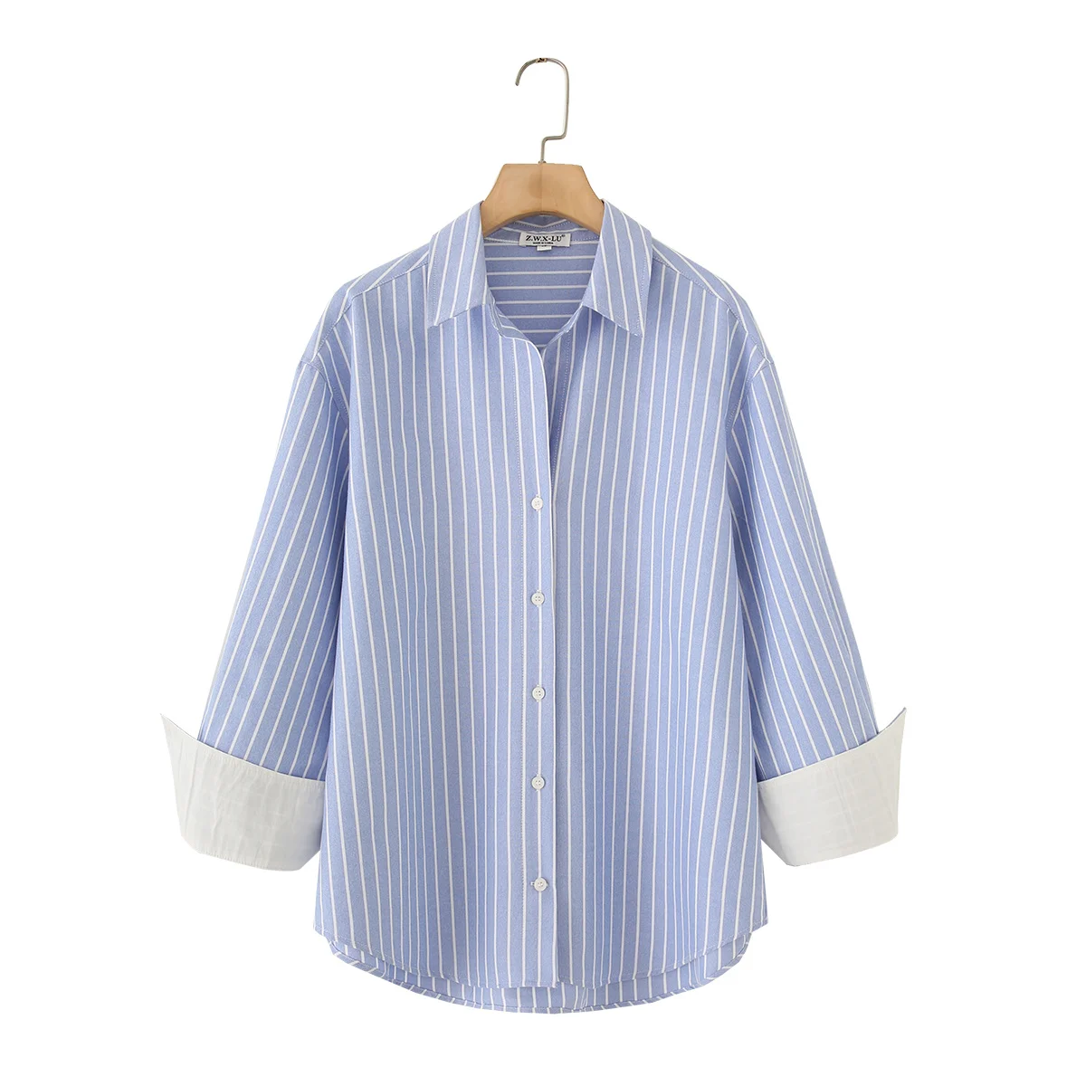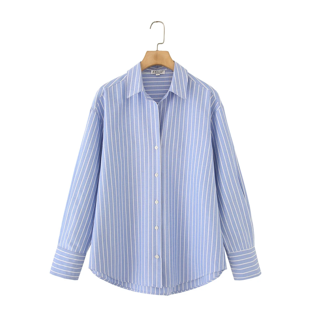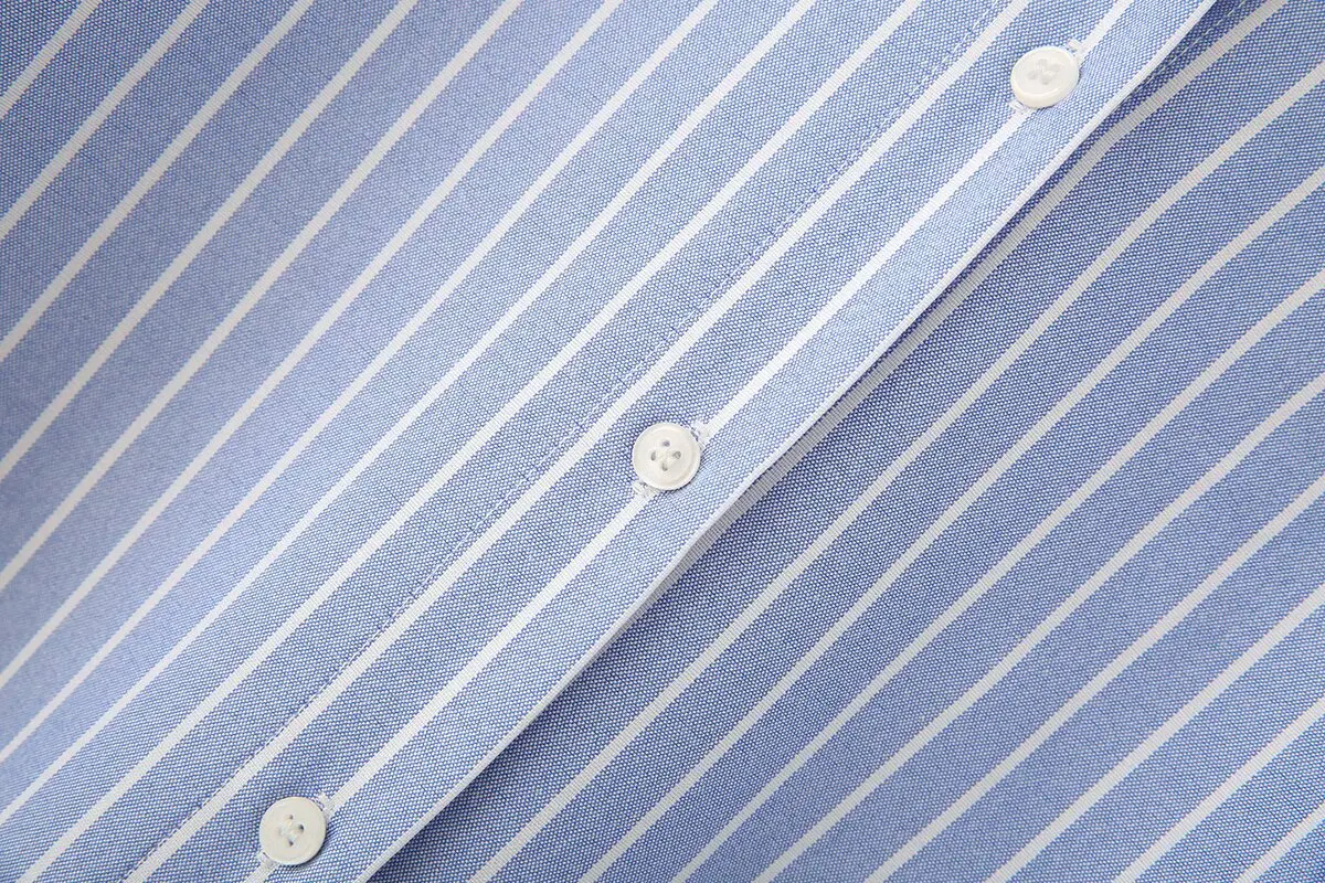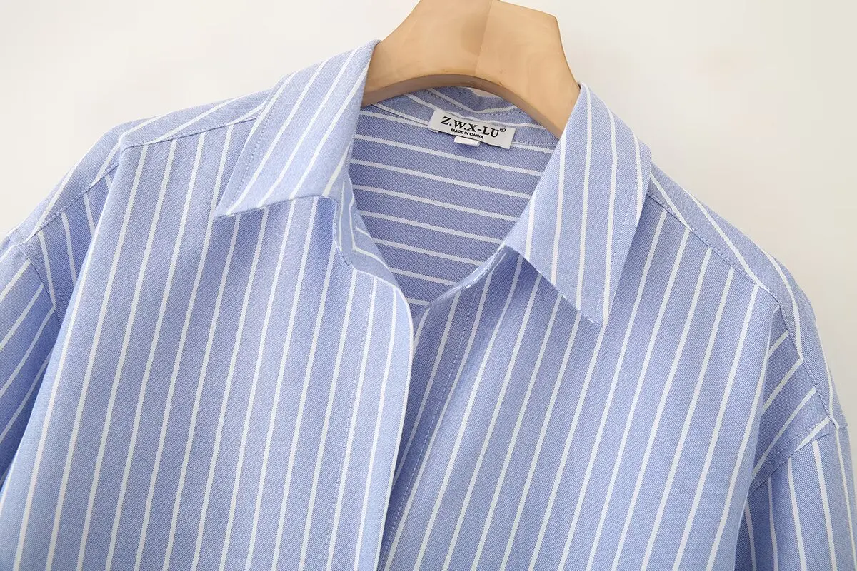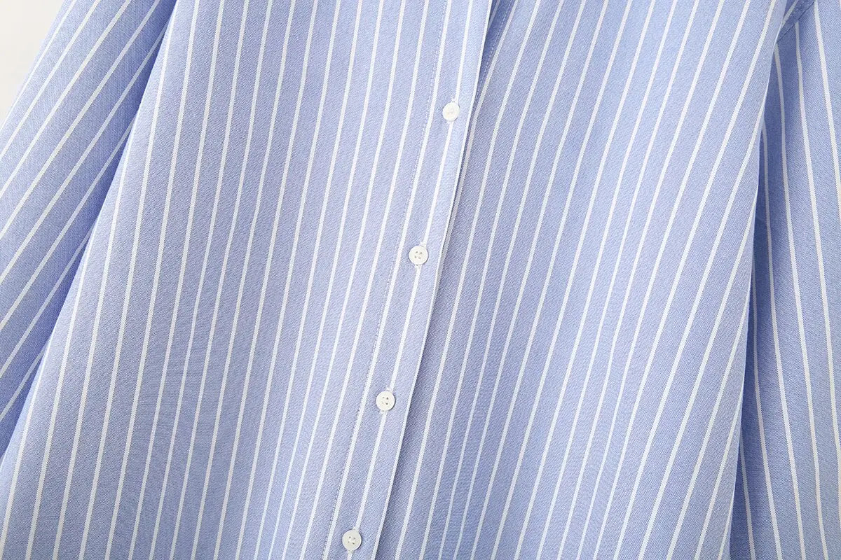 Blue Stripe Button-Down Shirt Women Oversized Fit Long Sleeve Spring Summer Elegant Office Casual Daily Wear Lightweight Top