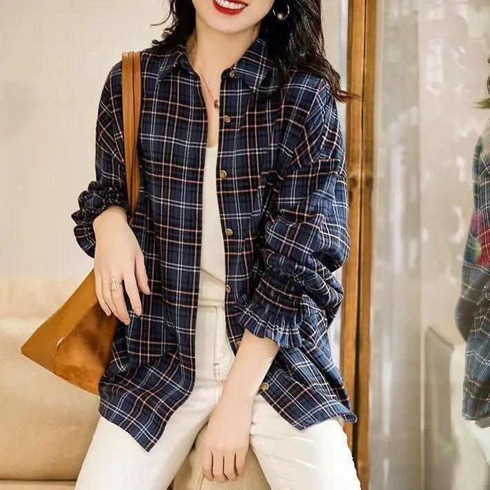 Long Plaid Button Down Shirt For Women Casual Office Wear Loose Fit Turn Down Collar Full Sleeve Spring Autumn Style