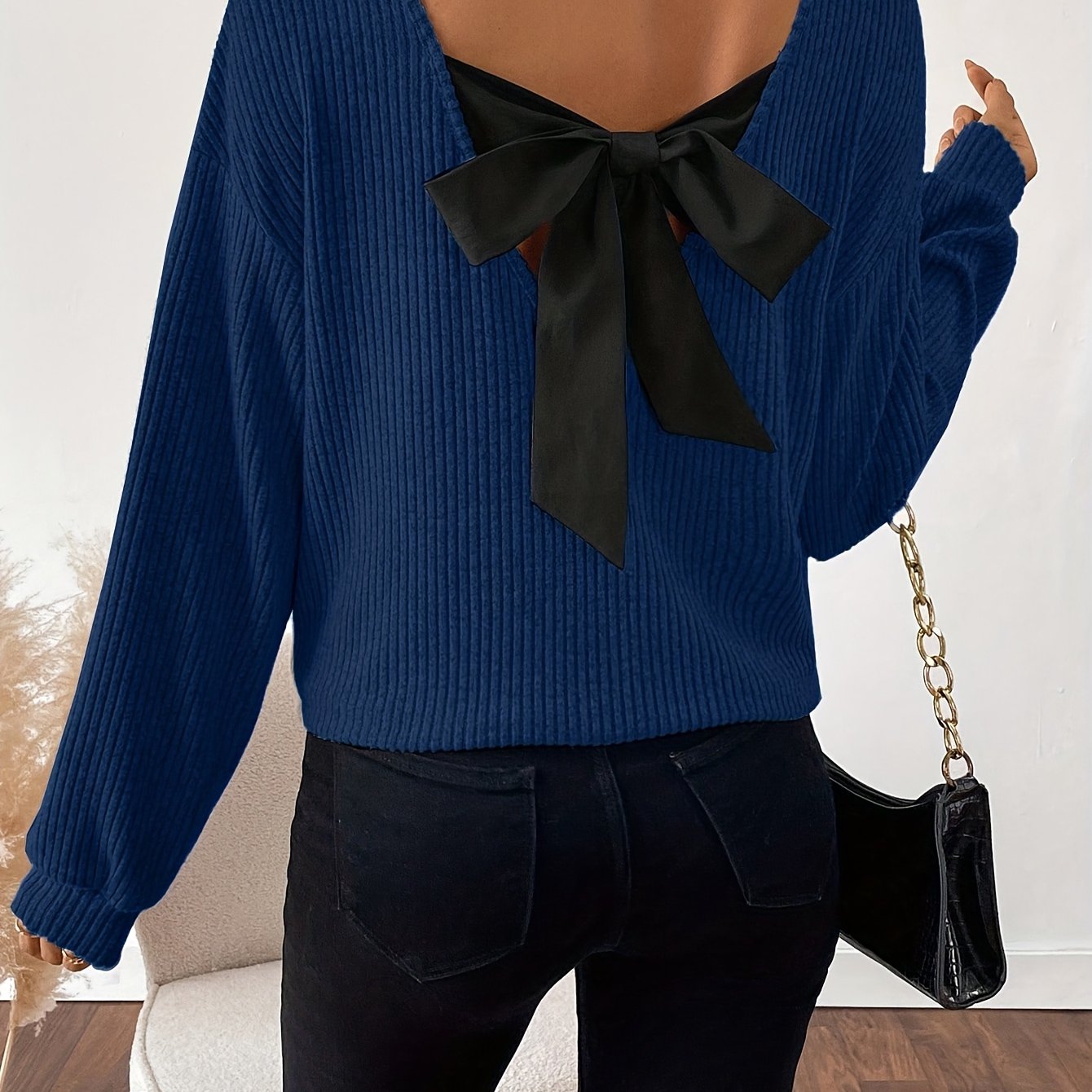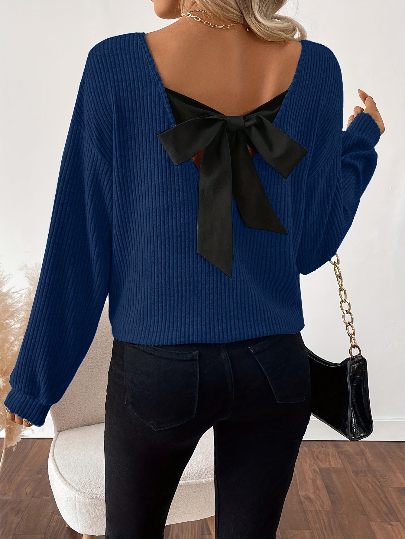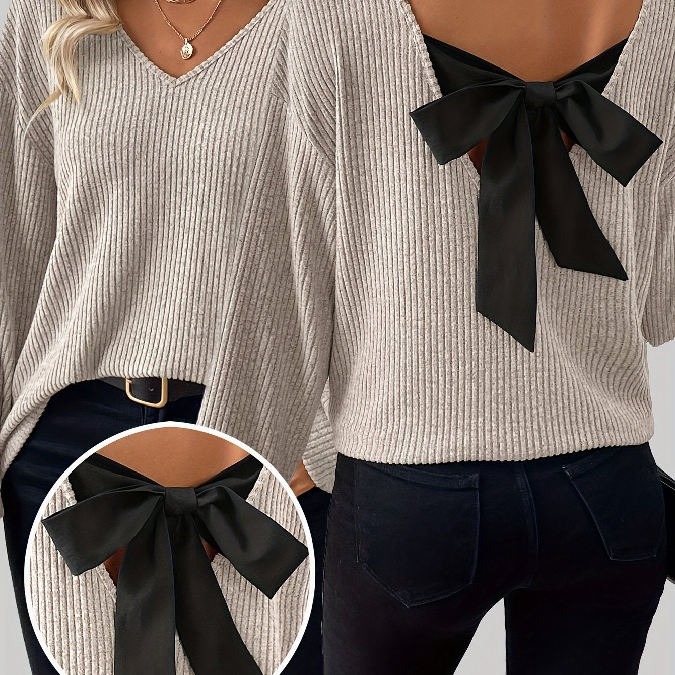 Women'S Elegant V-Neck Long Sleeve T-Shirt with Back Bow Detail - Soft Pink Ribbed Top, Black Bow Accent, Casual Chic Style for Spring/Fall, Ladies T Shirts, Women Elegant Winter Knitwear With Coloured Stone, Women Elegant Wi