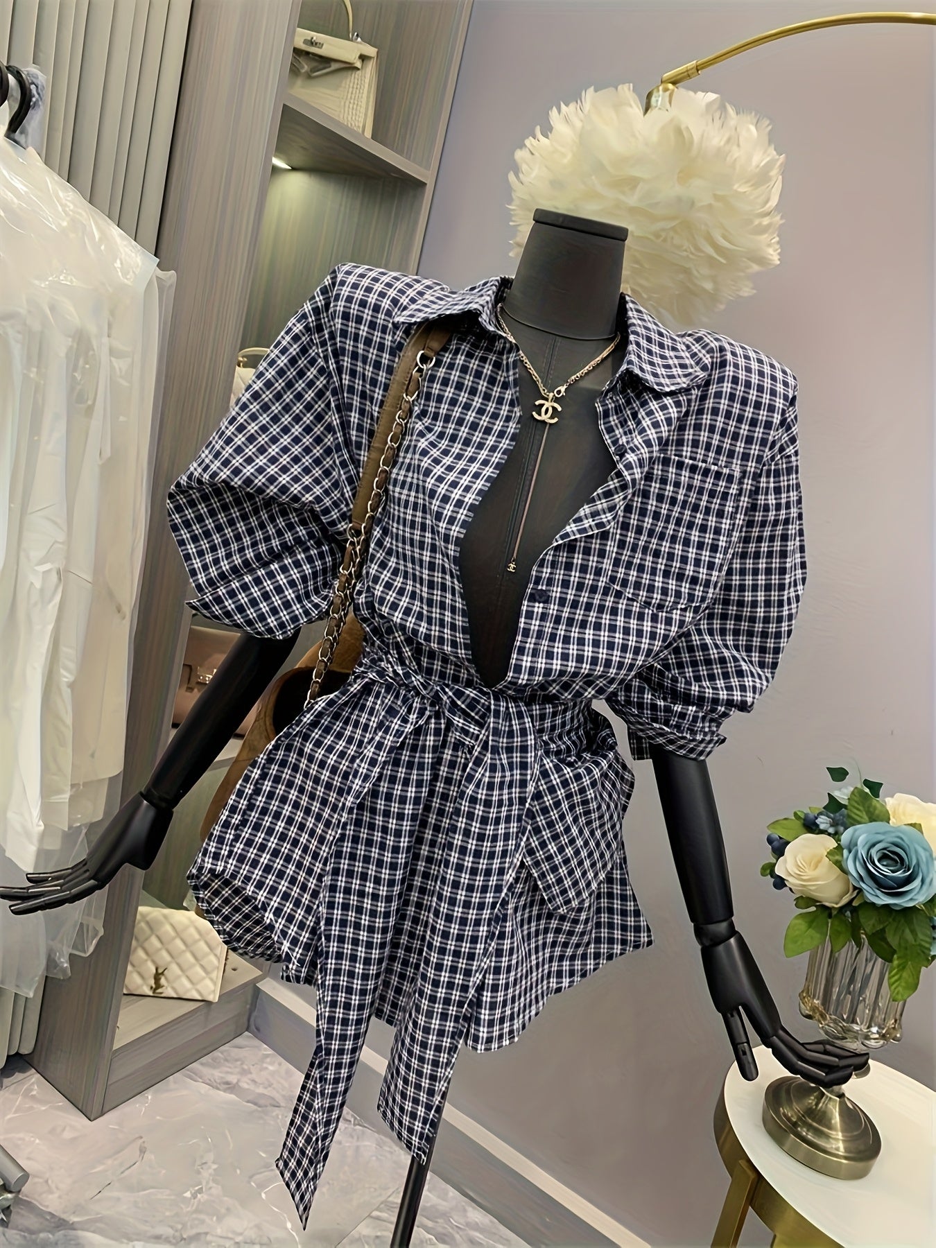 Women's Korean-Inspired Oversized Gingham Check Blouse with Belt-like Waist Tie - Blue & White Button-Front Shirt Jacket, Long Sleeve Layered Midi Length for Spring/Fall, Casual & Semi-Formal Wear (Machine Washable), Tops, Bl