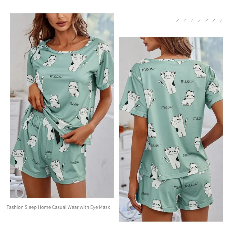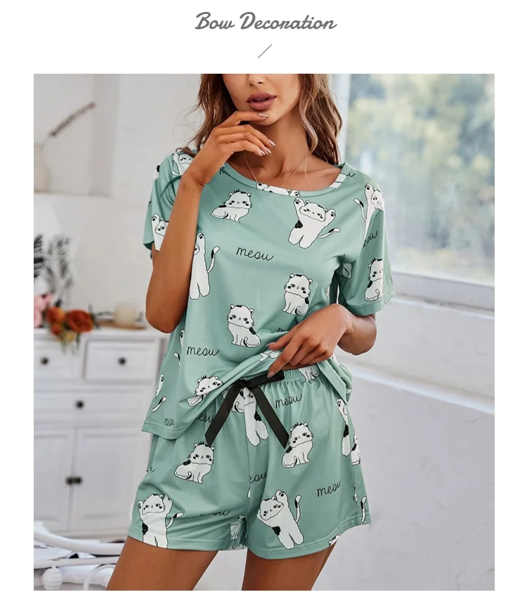 Women's Loungewear Casual Cute Print Nightwear Short Sleeve Crew Neck T-Shirt And Shorts Pajama Set Sleepwear Lounge Two Piece