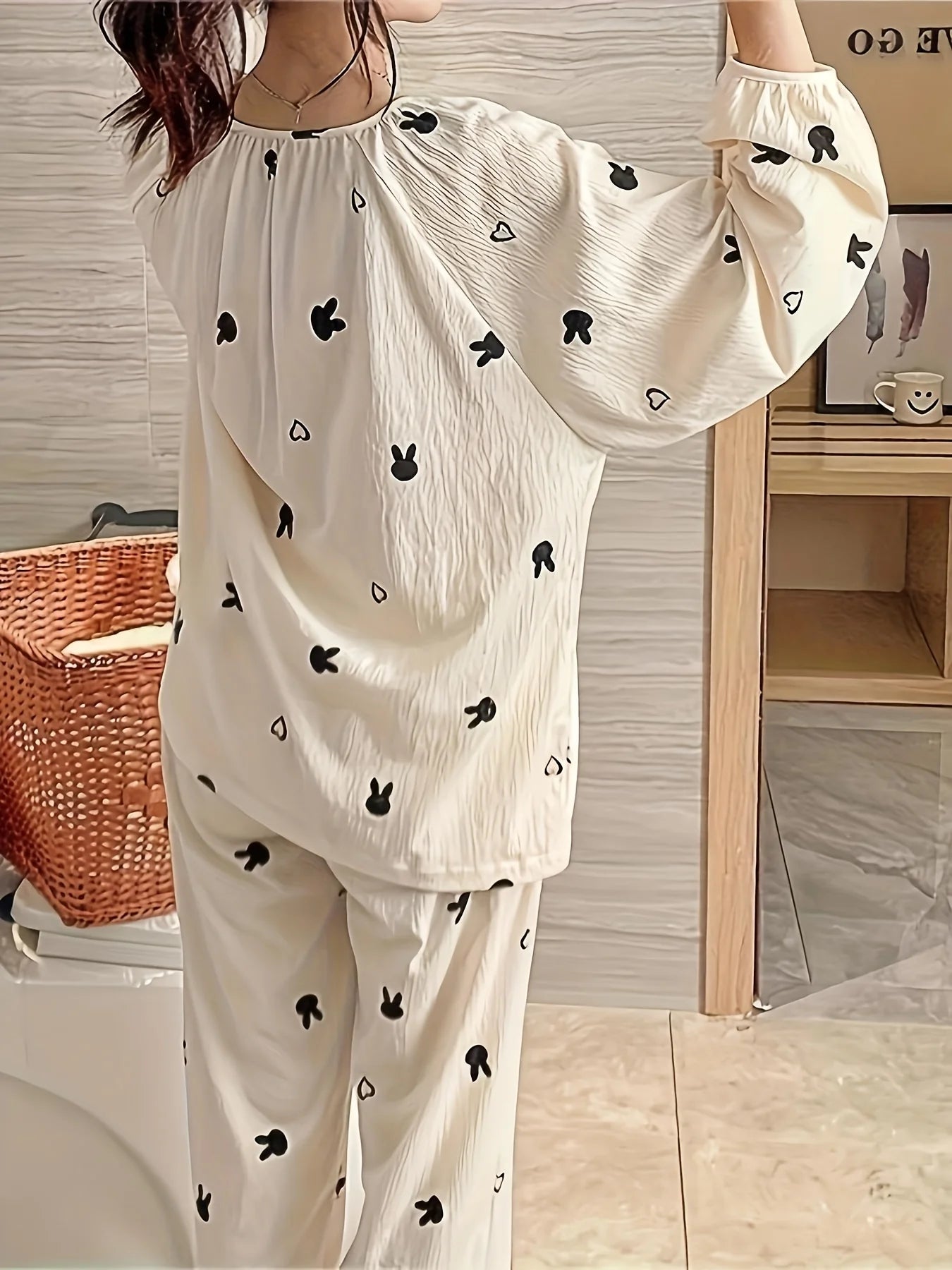Women's loungewear pajama set features a cardigan - style with a round - neck design, rabbit pattern, long sleeves and long pant