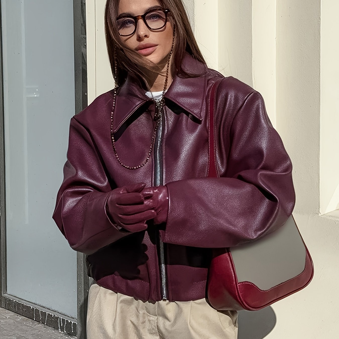 Women's Motorcycle Jacket - Full-Zip Retro Biker Coat with Full-Zip Front, Wine Red Matte, Relaxed H-Line Fit & Full-Length Zipper (No Collar) - Casual to Edgy Outerwear for Motorcycle Riding & Casual ttire, Jackets For Women