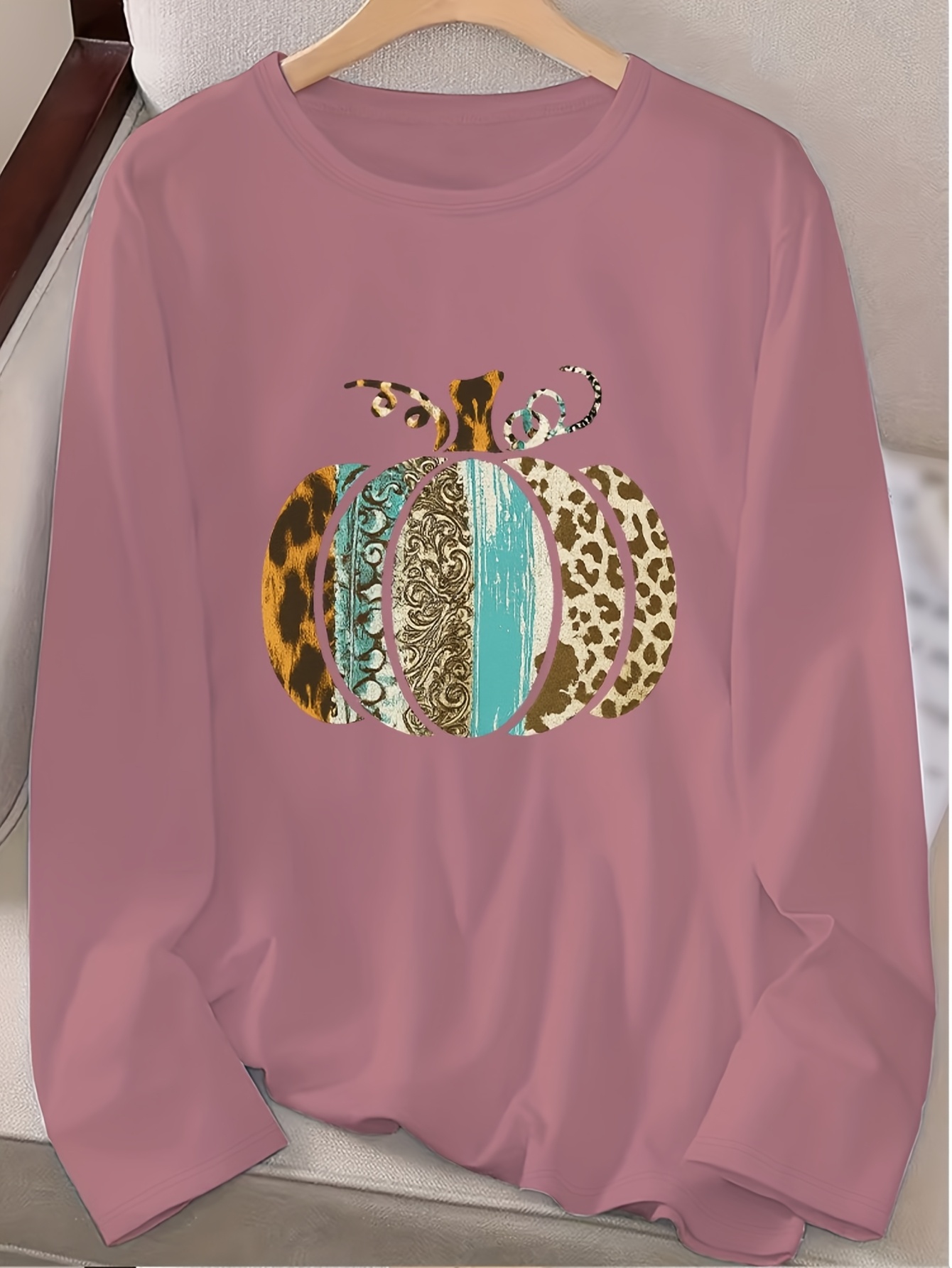 Women's Pumpkin Print Crew Neck Long Sleeve T-Shirt - Turquoise Blue & Golden Pumpkin Patch Design with Leopard Spot Accent, Casual Fall/Spring Top (Sizes S-2XL) | Pumpkin Season Outfits, Jeans Pairing, Machine Washable Layer