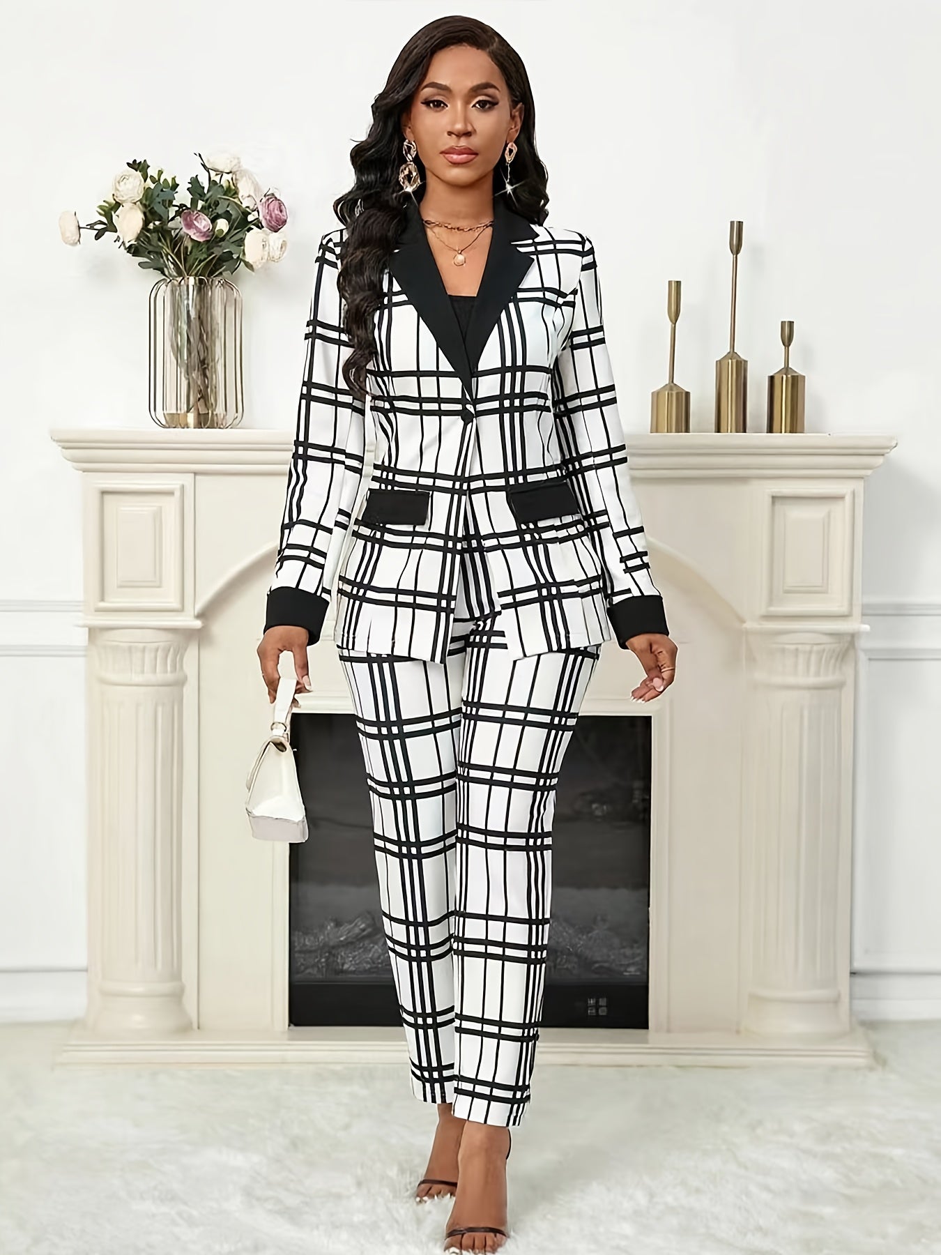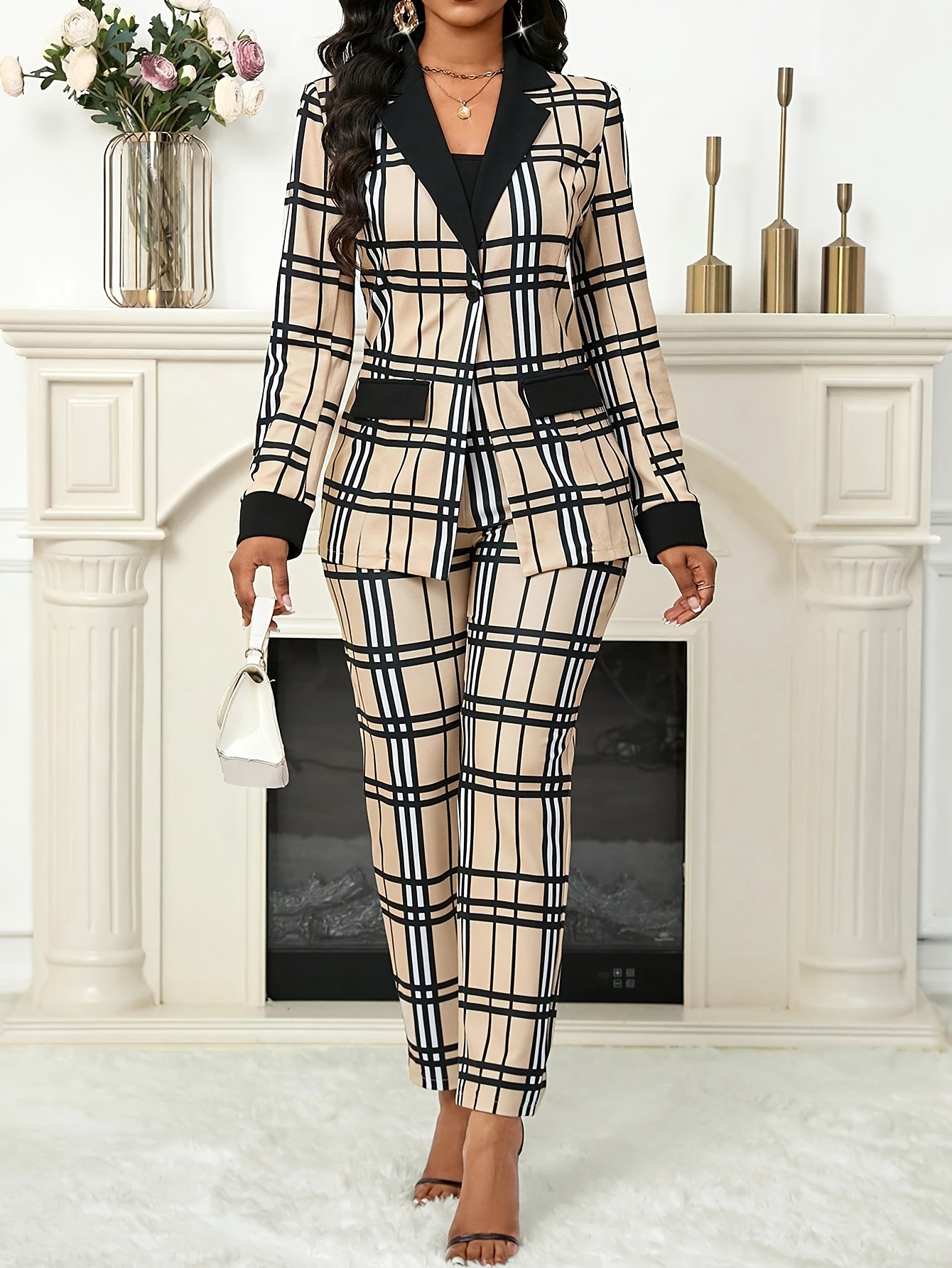 Women's Suit Set with Plaid Print and Black Collar Jacket, Pants - Autumn/Winter Work & Party Outfit, Two Piece Suits for Women, Suits for Women, Trouser Suits for Women, Formal Attire, Office Wear, Stylish Suitcase, Durable