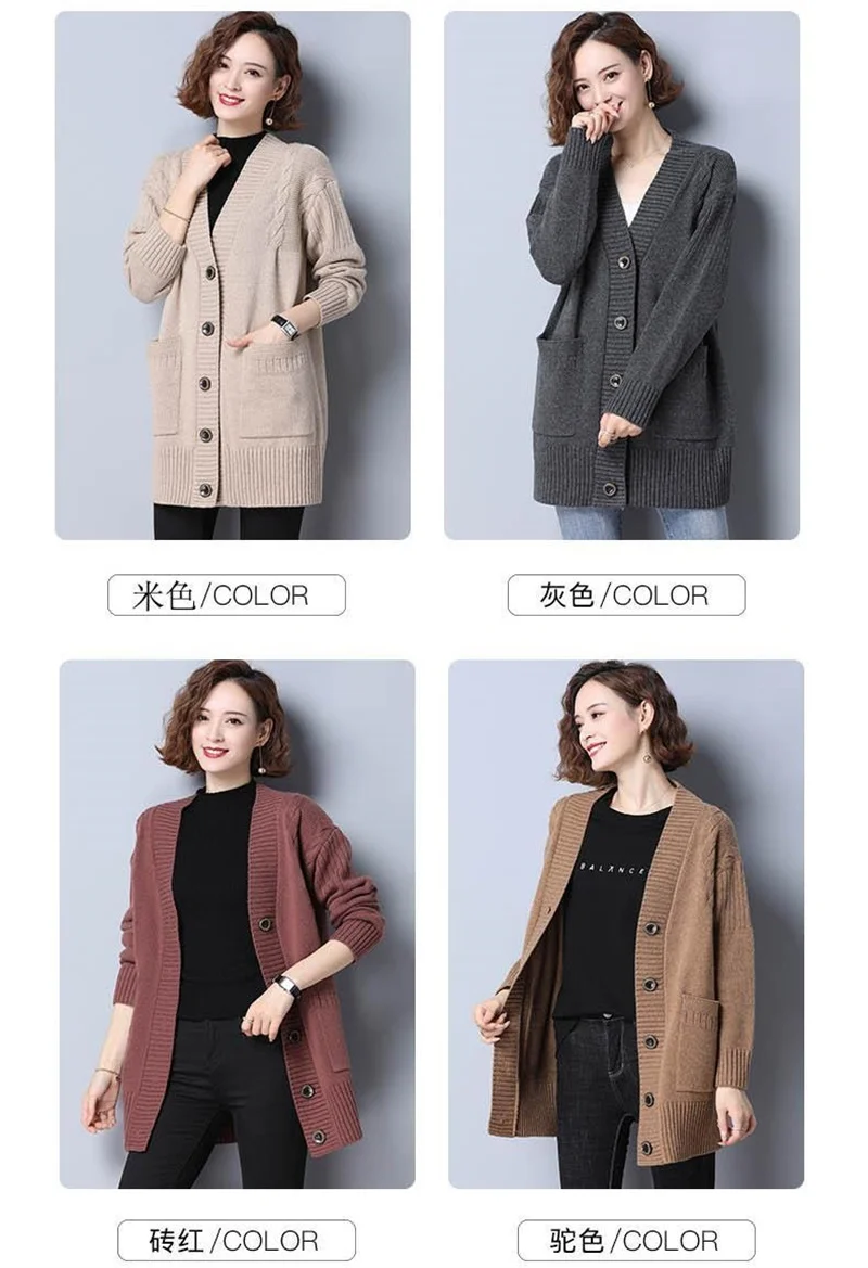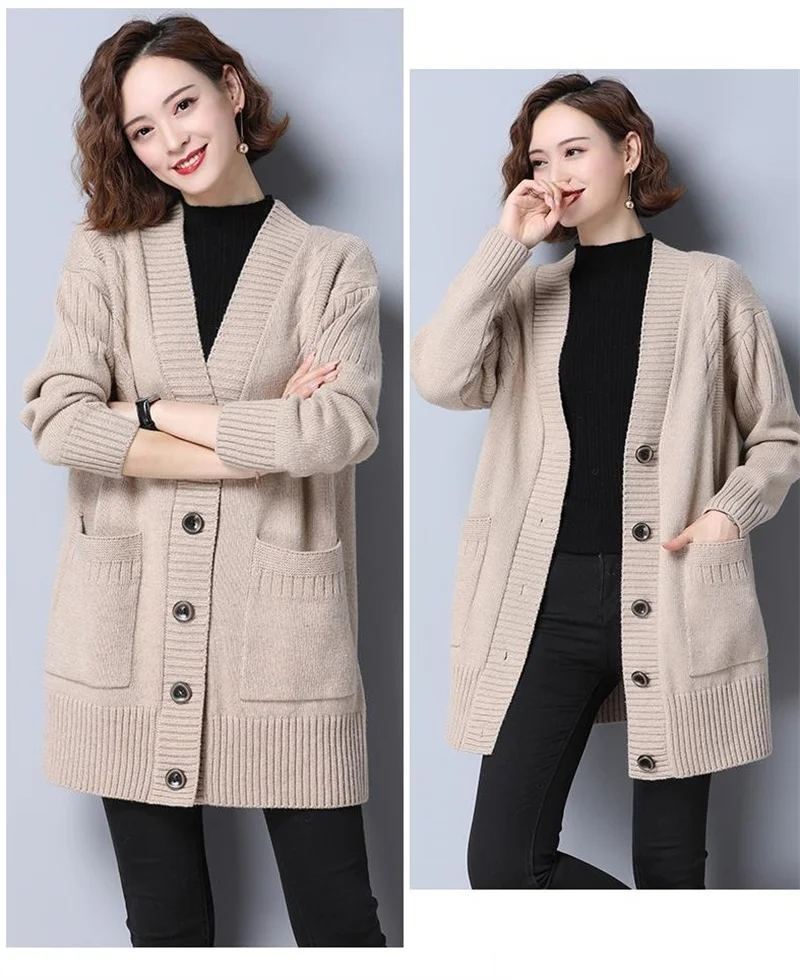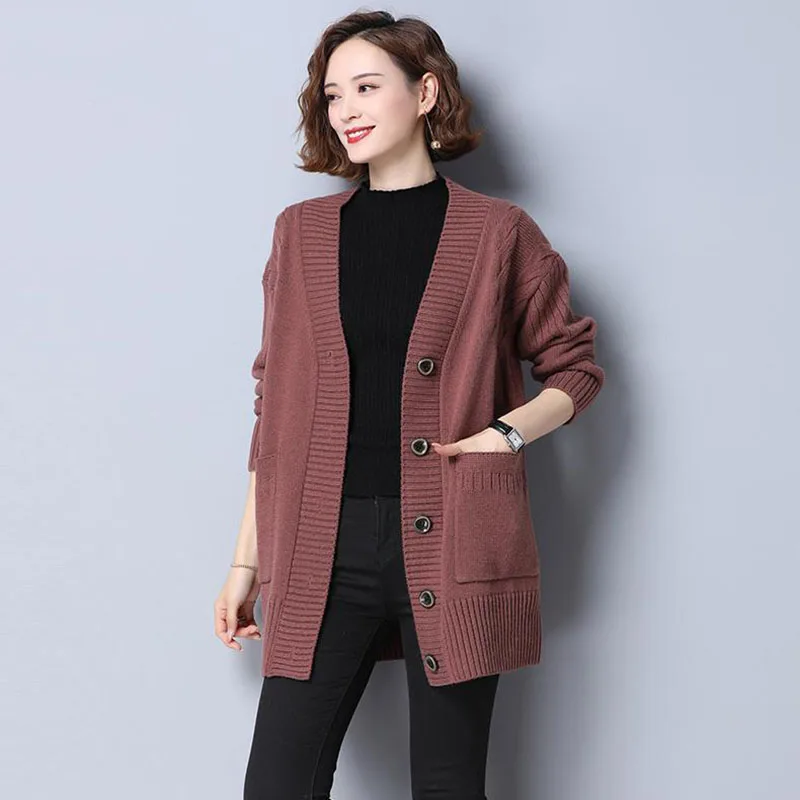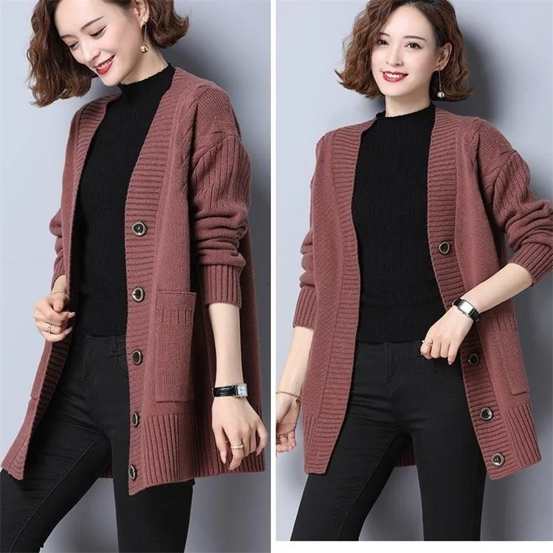 Women's Sweater 2025 New Autumn Winter Knitted Cardigan Female V-neck Blouses Loose Solid Single Breasted Knitt Coat Ladies Tops